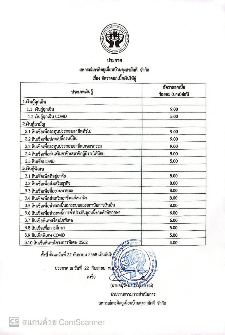 ประกาศอัตราดอกเบี้ยเงินรับฝากและเงินให้กู้ของสหกรณ์ฯ ประจำปี 2568